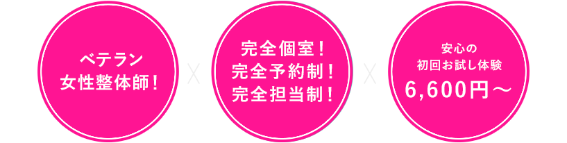 身体は一人ひとり違うもの。だからこそ当院ではあなたのお話をしっかりと伺った上で、今のあなたに必要な施術をご提案し、お悩み・お好みに合わせた施術を行っていきます。女性スタッフだからこそ女性特有のお悩みに寄り添い、女性スタッフでも力強いしっかりとした施術までできることが整体塾の誇りです。