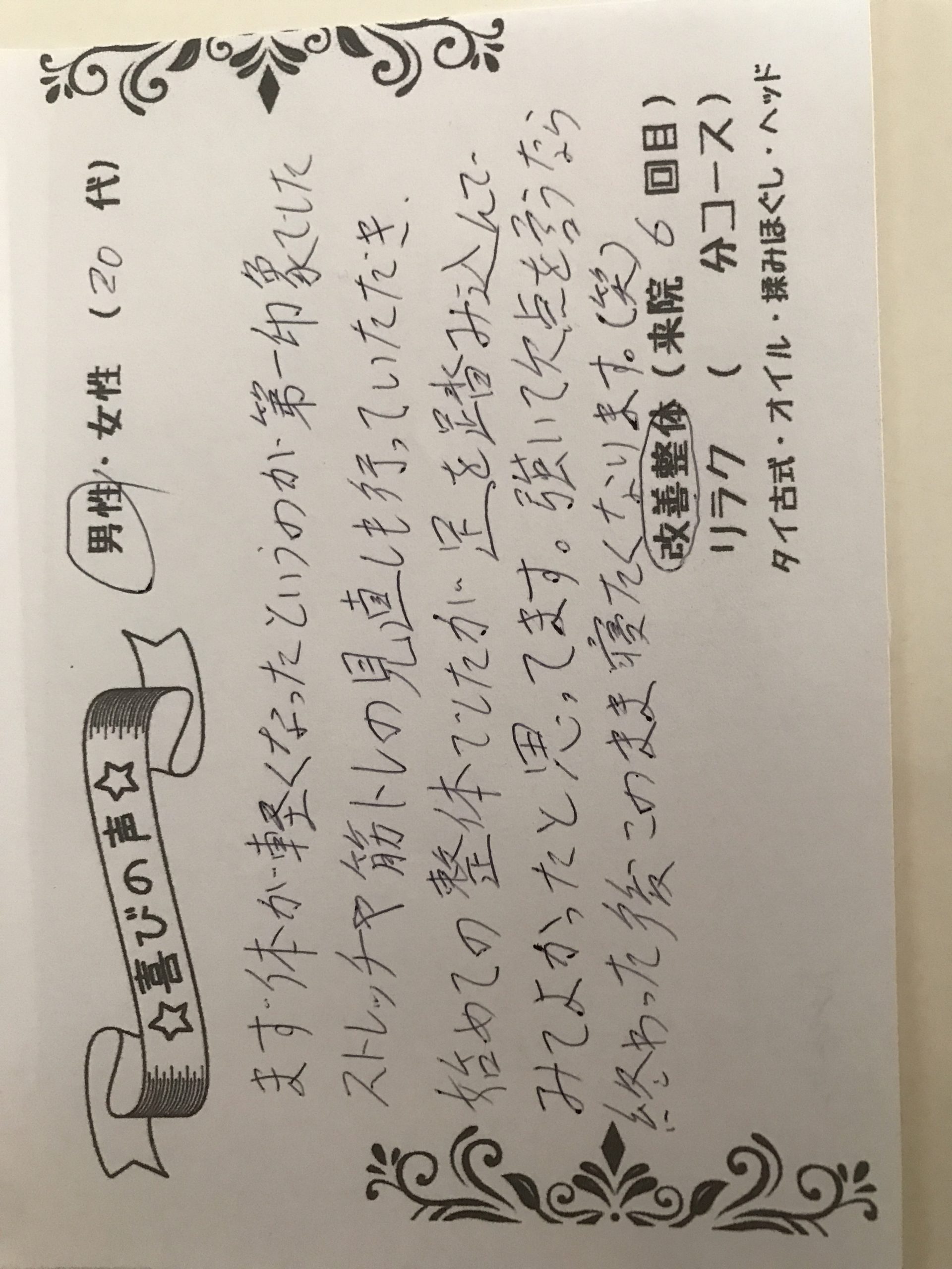 お客様の喜びの声 ブログ 喜びの声 こんにちは!整体塾のアケミです。 先日、6回目のご来院をされた方の喜びの声が届きました♪ 初来院時、整体自体が全くの初めてという事で少し緊張されていたこともありますが、お仕事上、身体も疲労が溜まり、とても硬かった印象があります。 ご自身でのケアと整体塾での施術で以前のような症状はほとんど出ていないとのことです。 最近では、「泊まって行ってもいいですか?(笑)」と仰る程、リラックスされていて嬉しい限りです! 次回ご予約日もお会いできるのを楽しみにしております♪ SHAREシェアする ブログ一覧